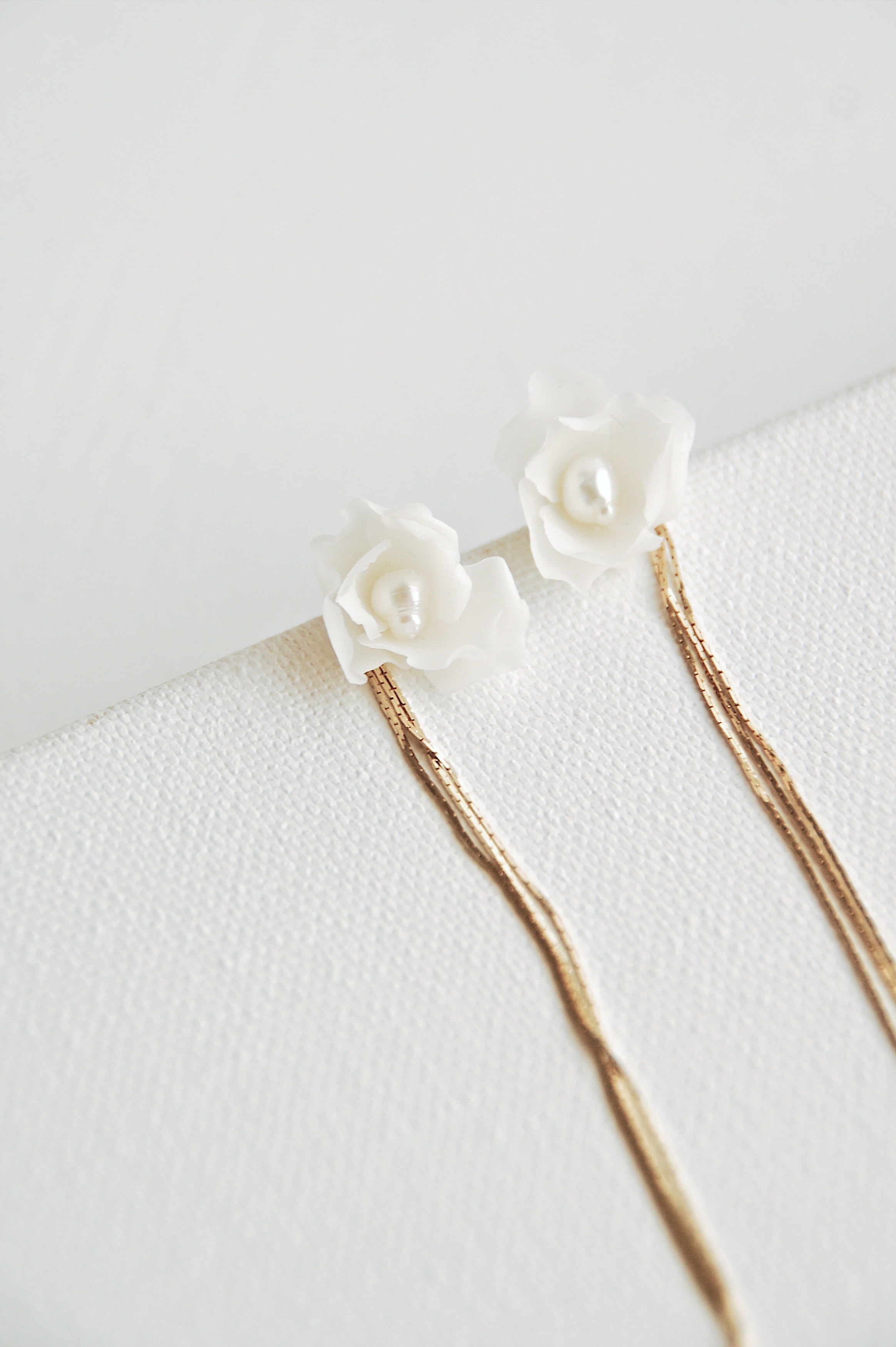 透けるポリマークレイを限界まで薄くのばし一枚一枚重ね、丸みやいびつさをそのまま生かしてまとめた、立体感が美しい耳飾り。透け感のある花は柔軟性がありつつ丈夫でとても軽く、中心にはアクセントとしてユニークなかたちの淡水パールを合わせました。取りはずしできる3本のチェーンは、シンプルなデザインに流れをつくり開いたネックラインを魅力的に彩ります。