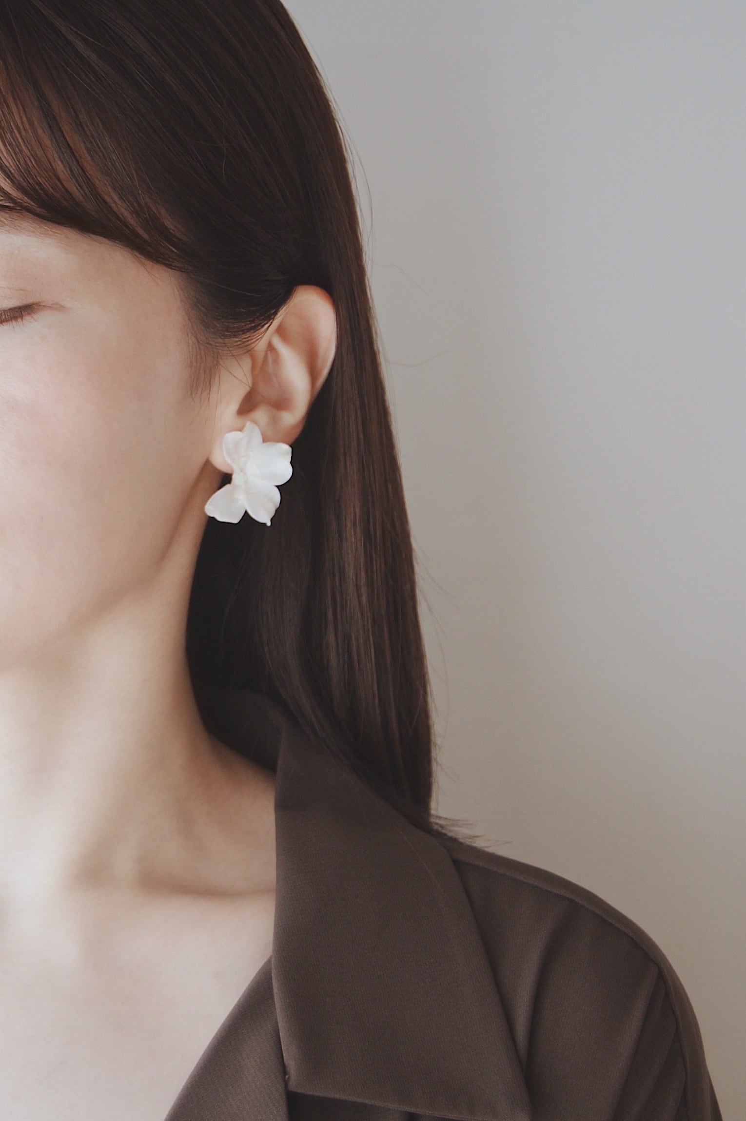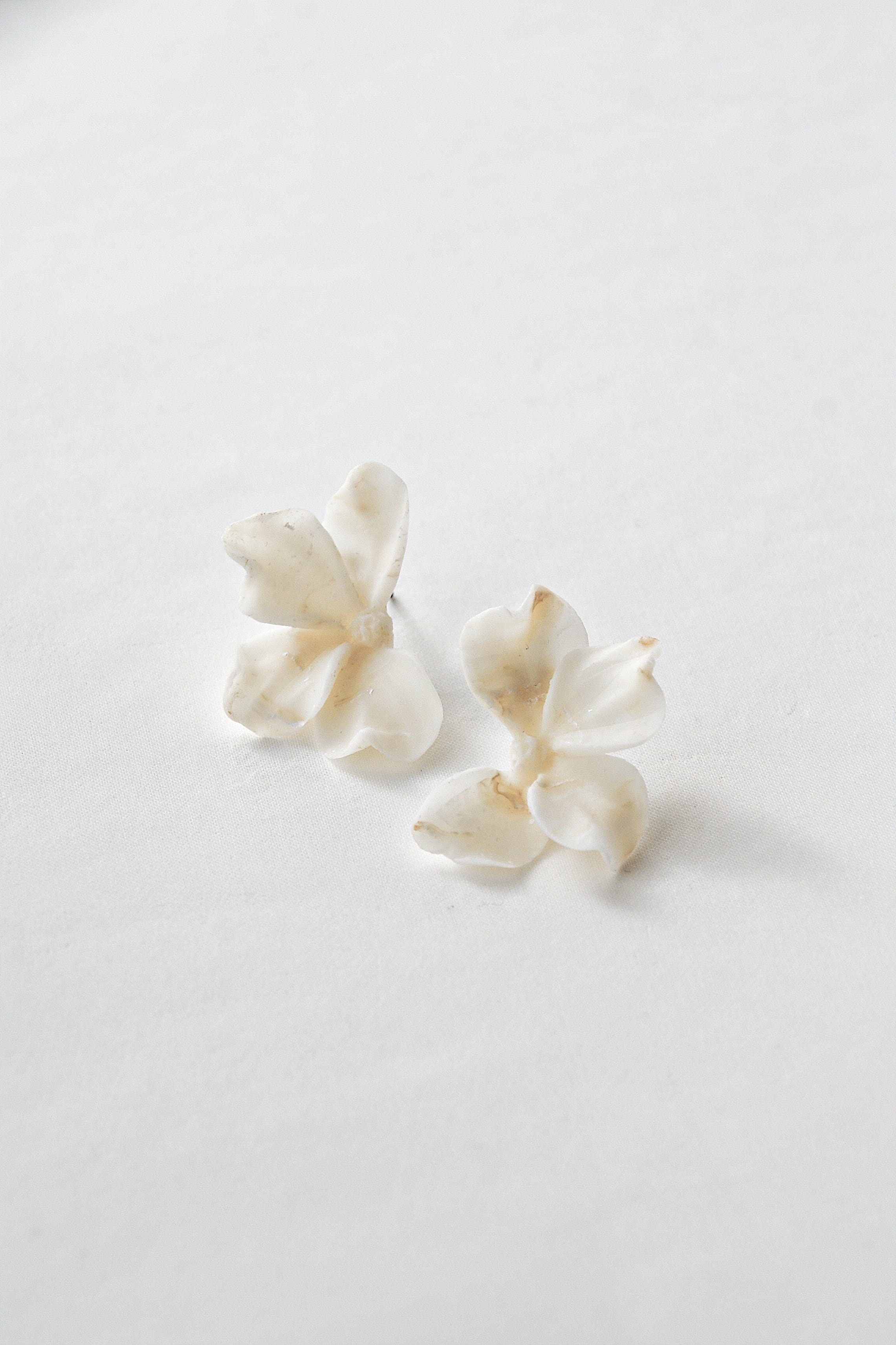 天然石をイメージした、ランダムなマーブル模様が特徴の耳飾り。ベージュ 、アイボリー、ホワイト、クリアのクレイを混ぜ合わせ、花びらを一枚ずつ丁寧に広げています。同じ模様・かたちは一つとしてない唯一無二の表情が楽しめるアクセサリーです。