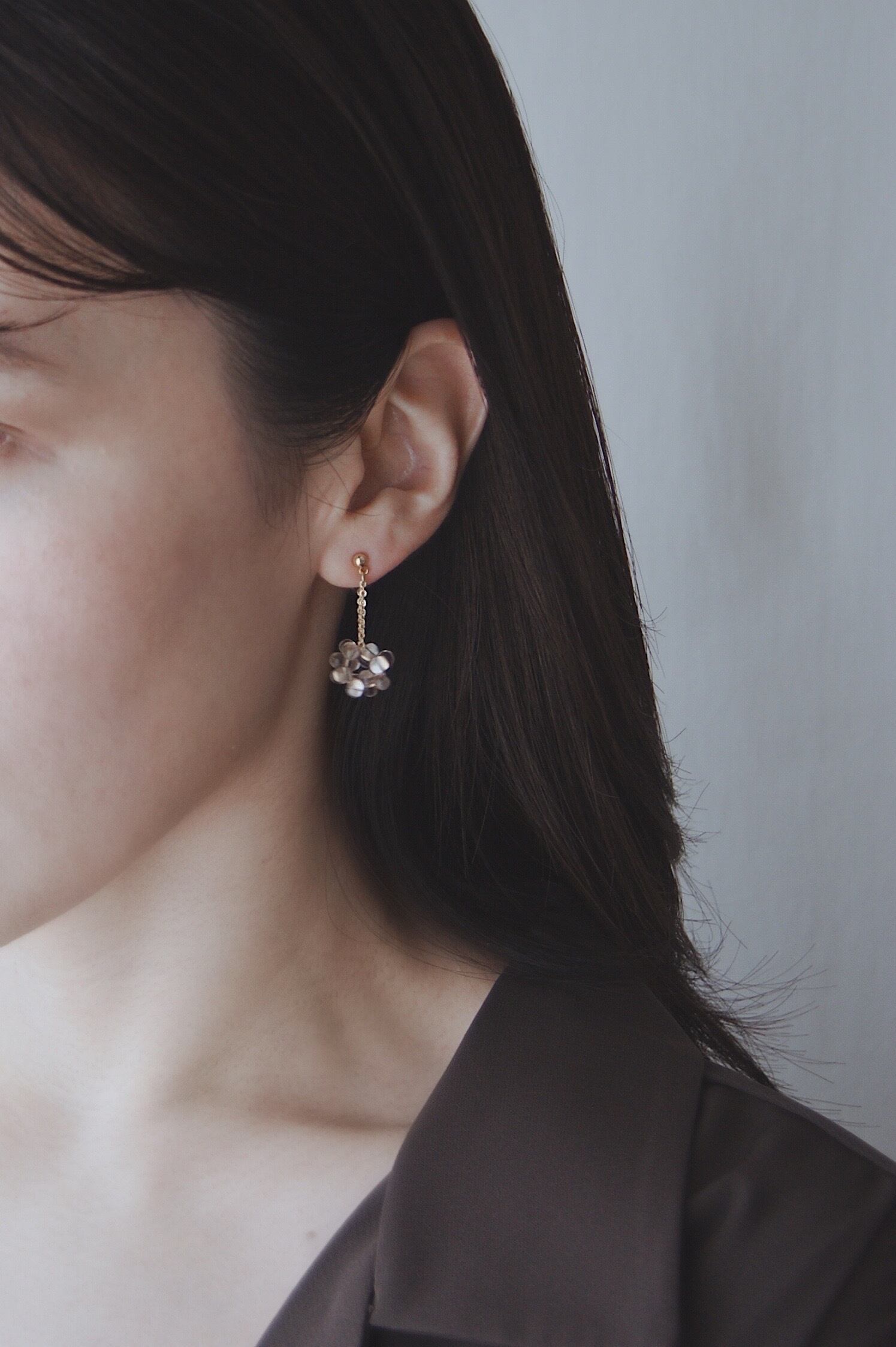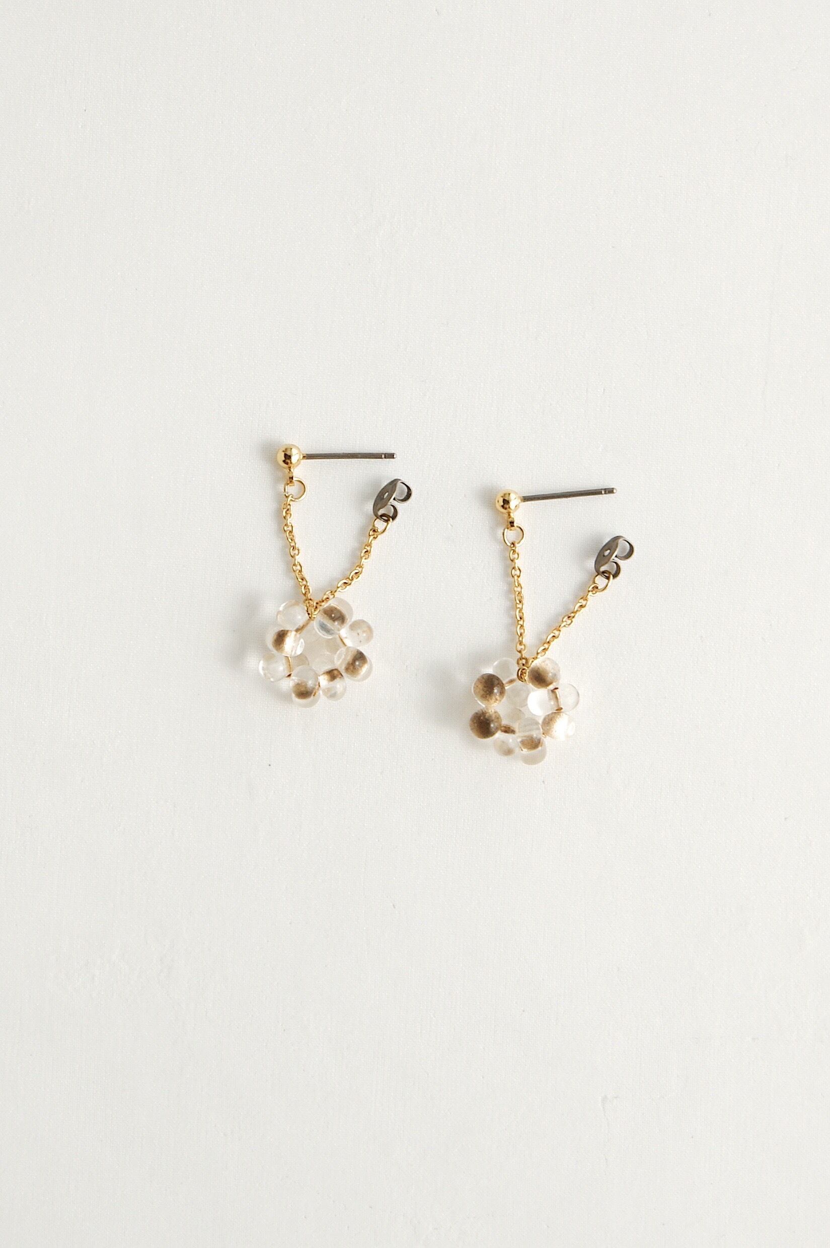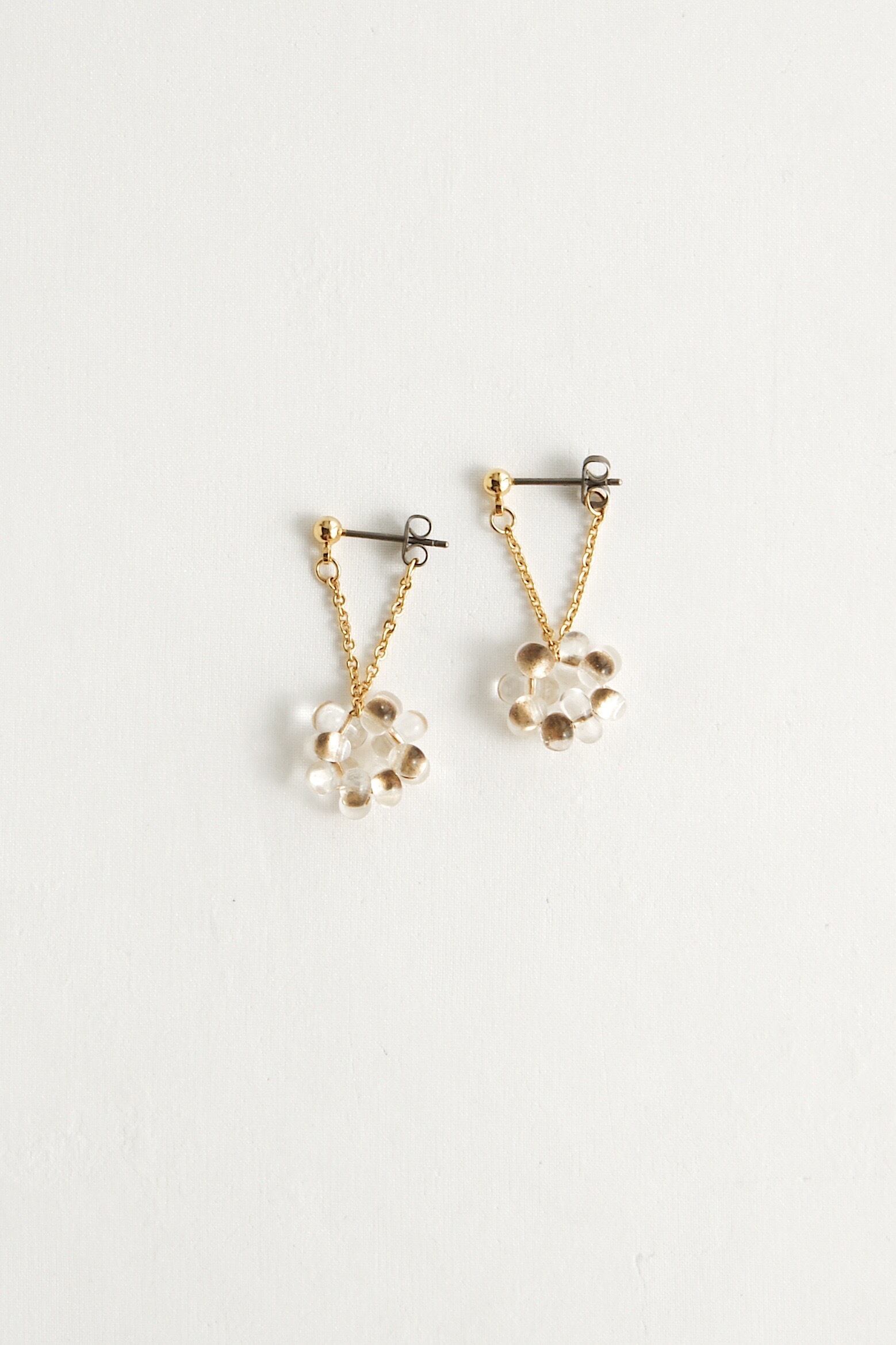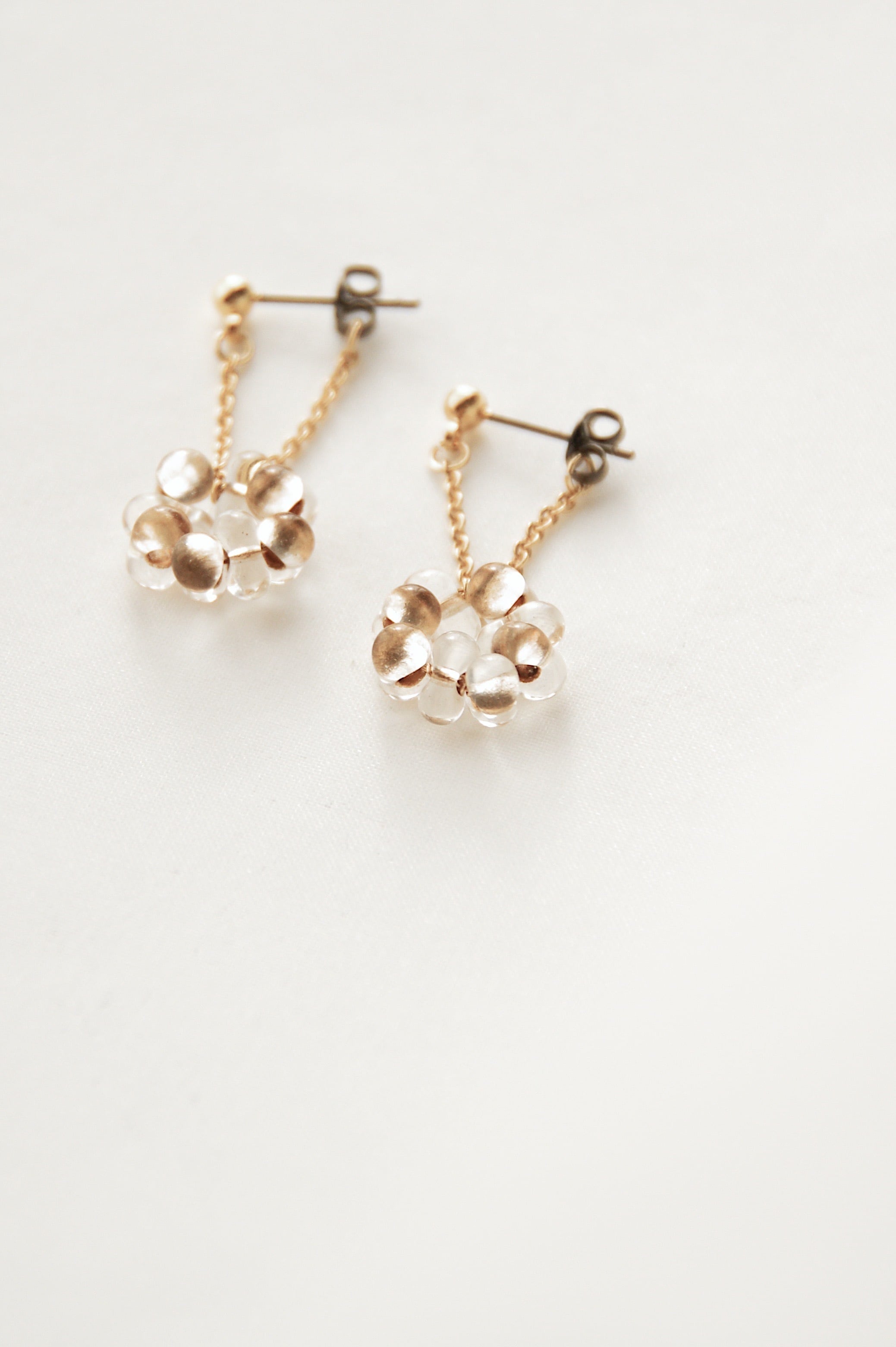 つぶつぶの実をイメージし、ガラスビーズをワイヤーでつないだ、透け感が魅力のシンプルなピアス。ガラスの輪をキャッチにつながったチェーンに通すことで、動きに合わせてガラスがキラキラと輝き、丸みと透明感で柔らかい印象に。