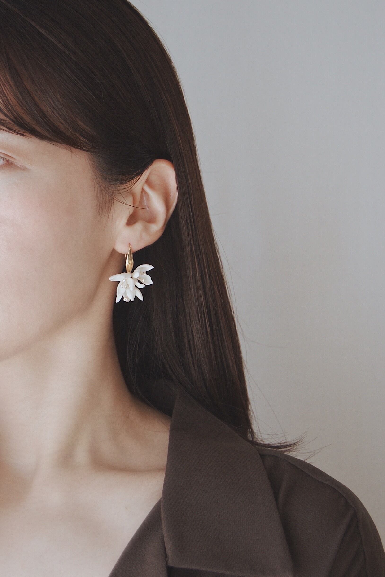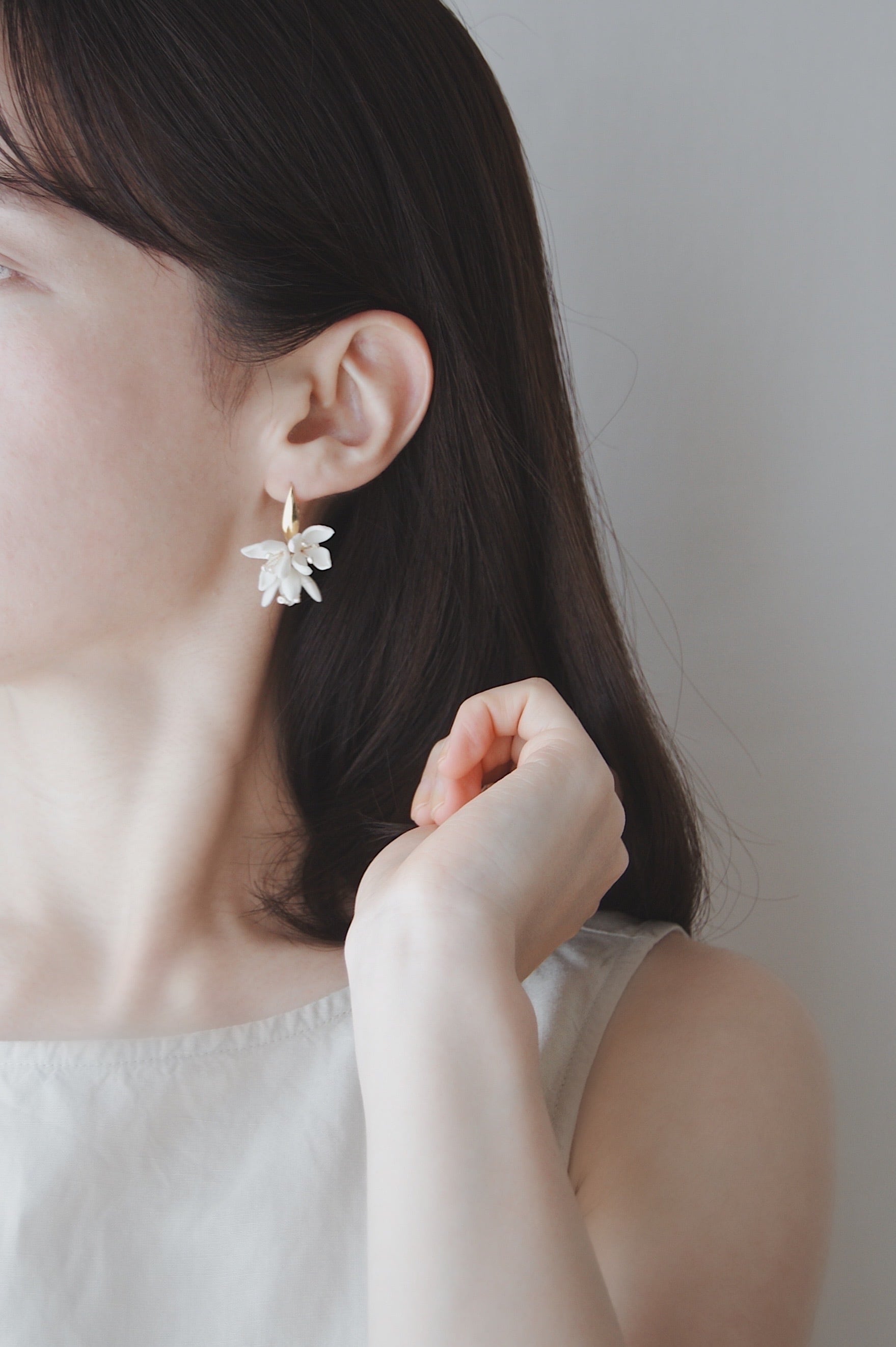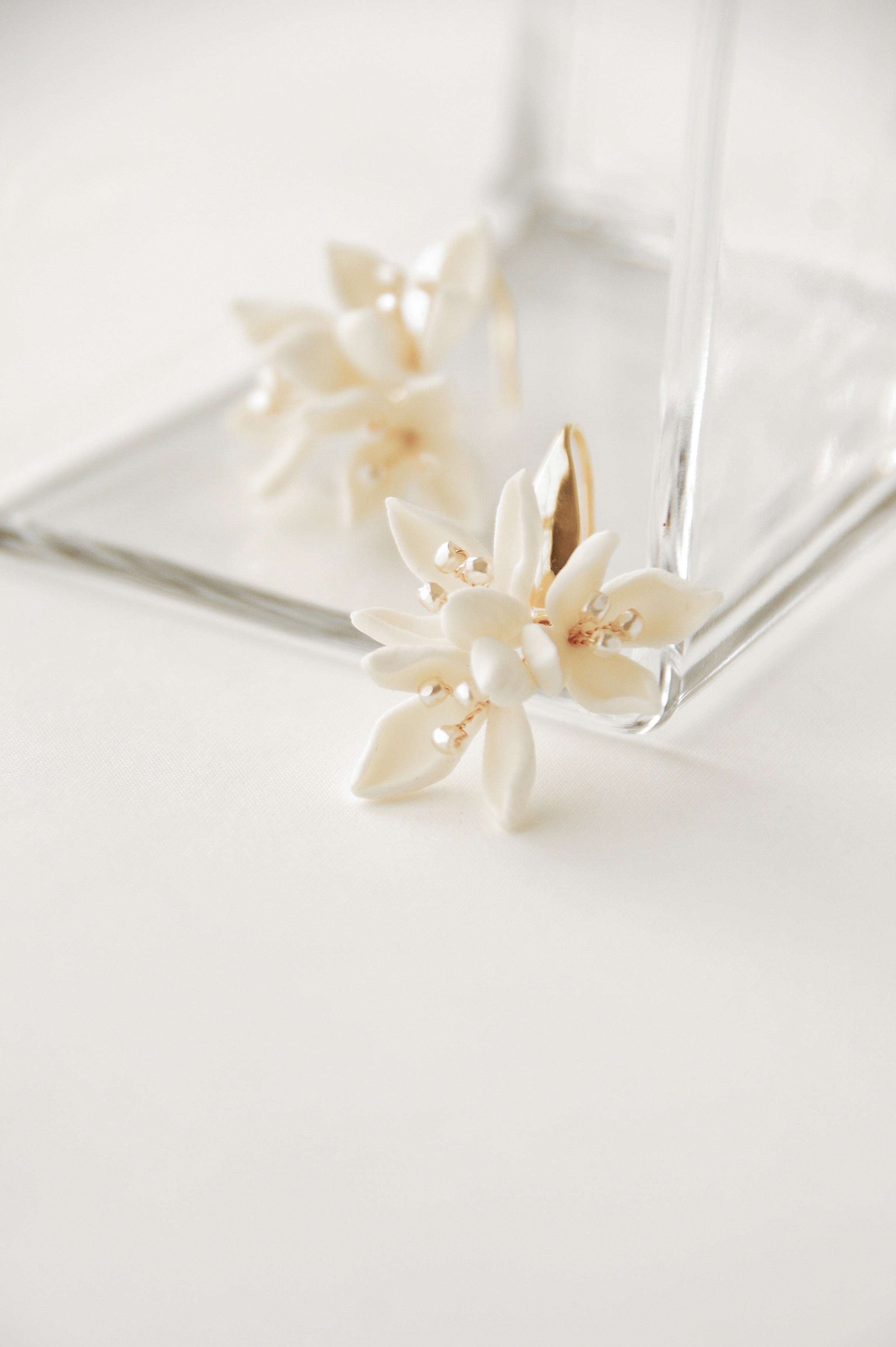 オレンジの花をモチーフにした "Neroli" シリーズは、あたたかみのある白、分厚くマットな花びらの小花が特徴です。クレイで花びらを一枚ずつ丁寧に広げ、中心にはパールコーティングされたガラスビーズを合わせました。繊細な3つの小花がギュッとあつまったひと房に、葉をイメージしたフラットな金具を合わせて華やかなデザインに。