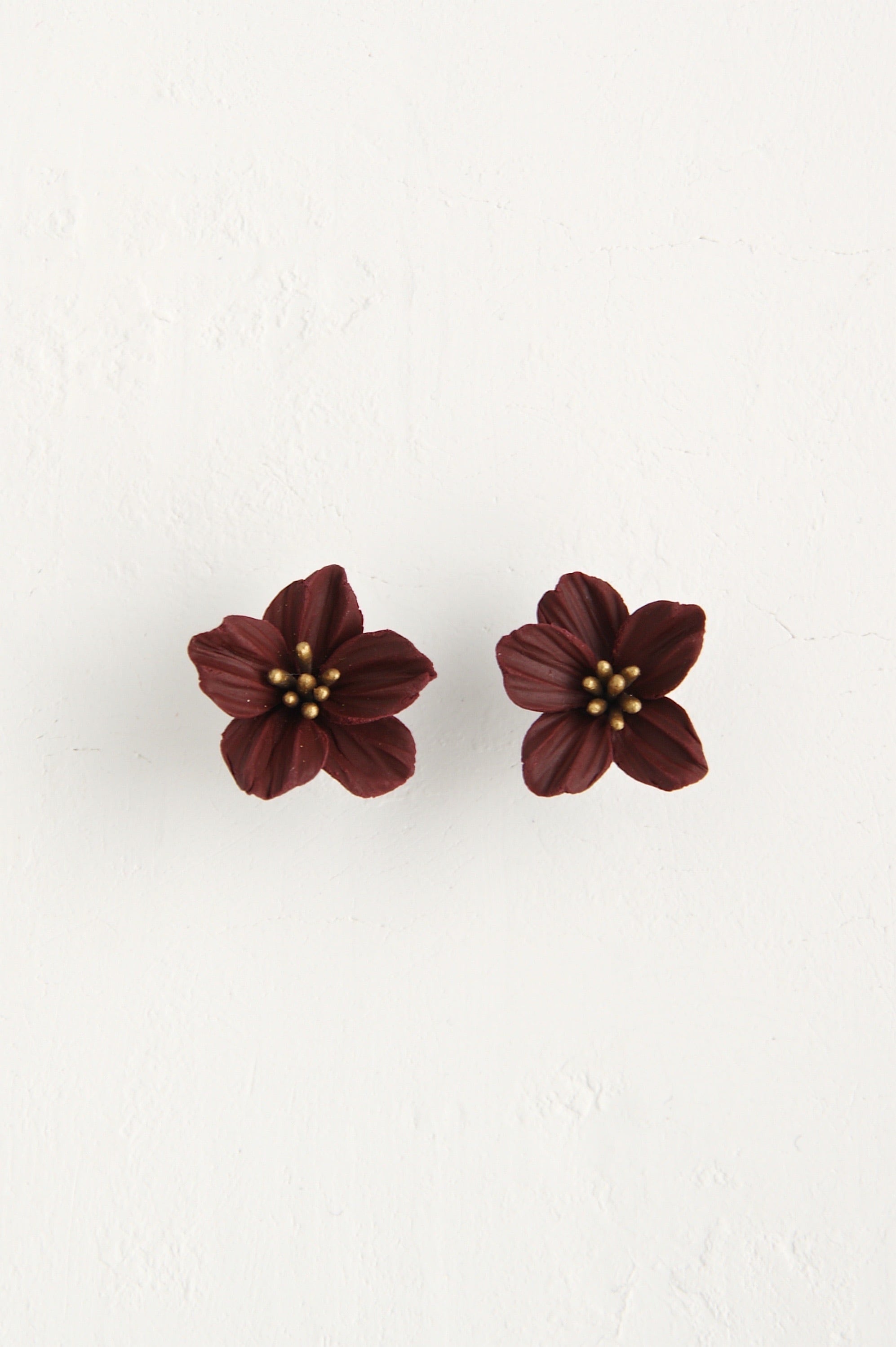 チョコレートコスモスをモチーフにした一輪の耳飾り。マットでこっくりとしたボルドーの花びらにダークブラウンの花芯を合わせ、先端にゴールドのペイントを施しました。リップなどの色味に近いので、メイクやファッションのワンポイントになるような使いやすいデザインです。