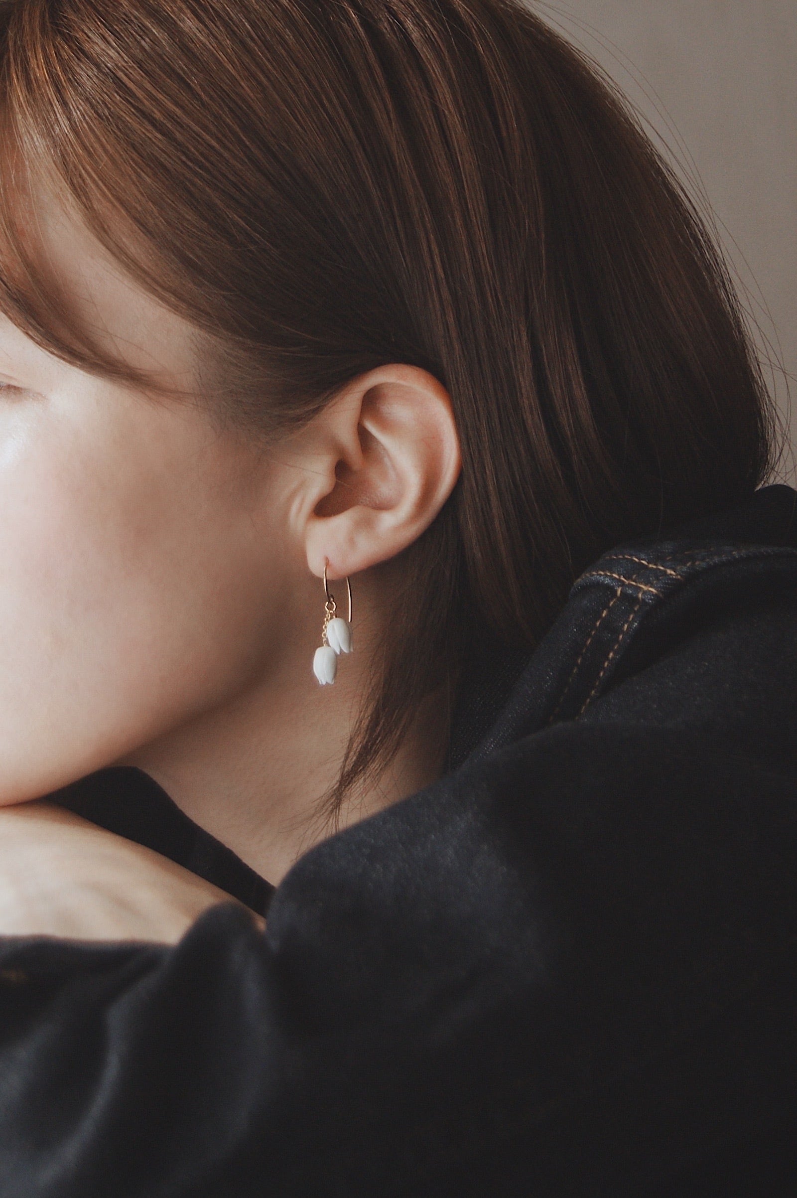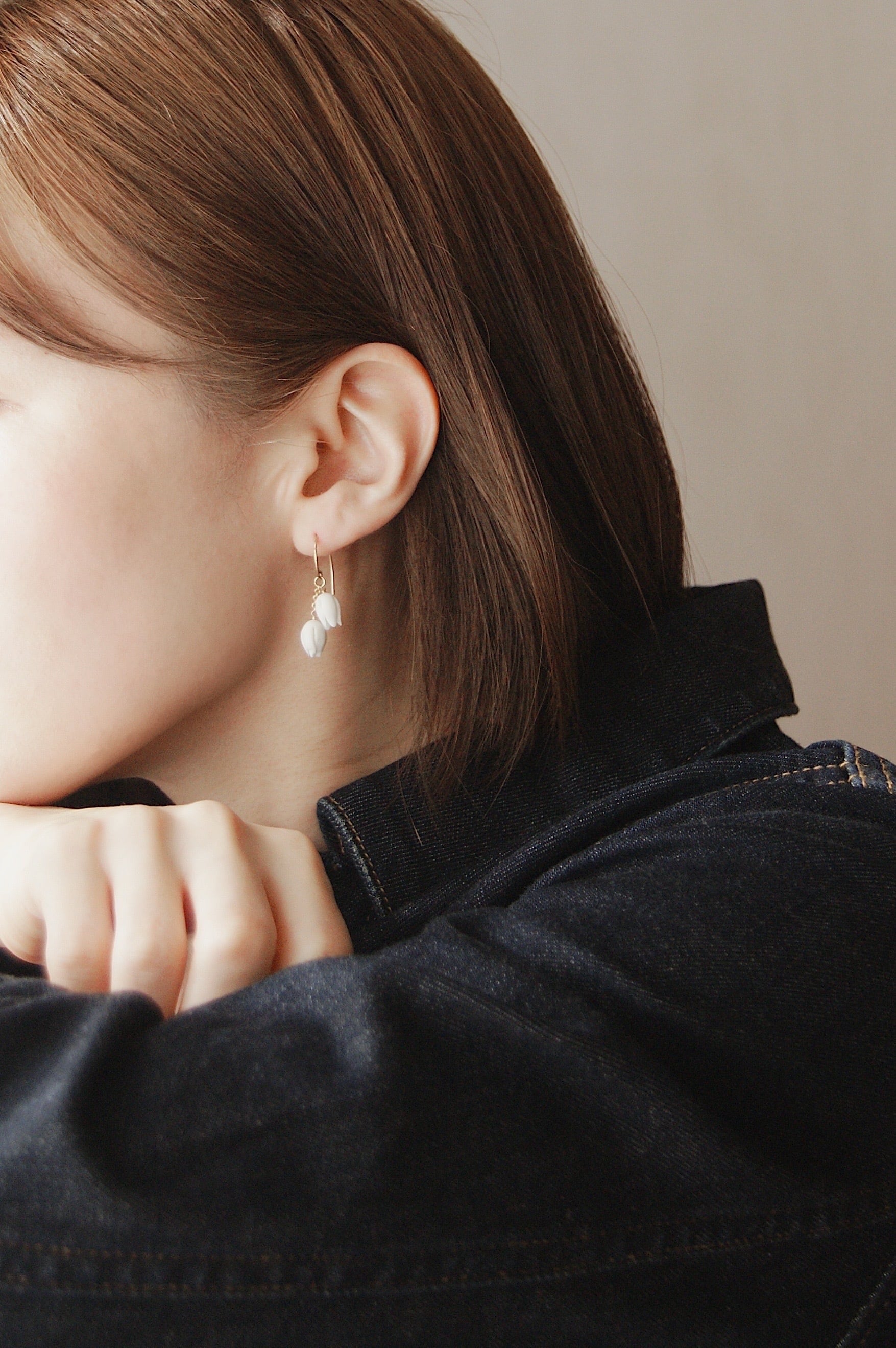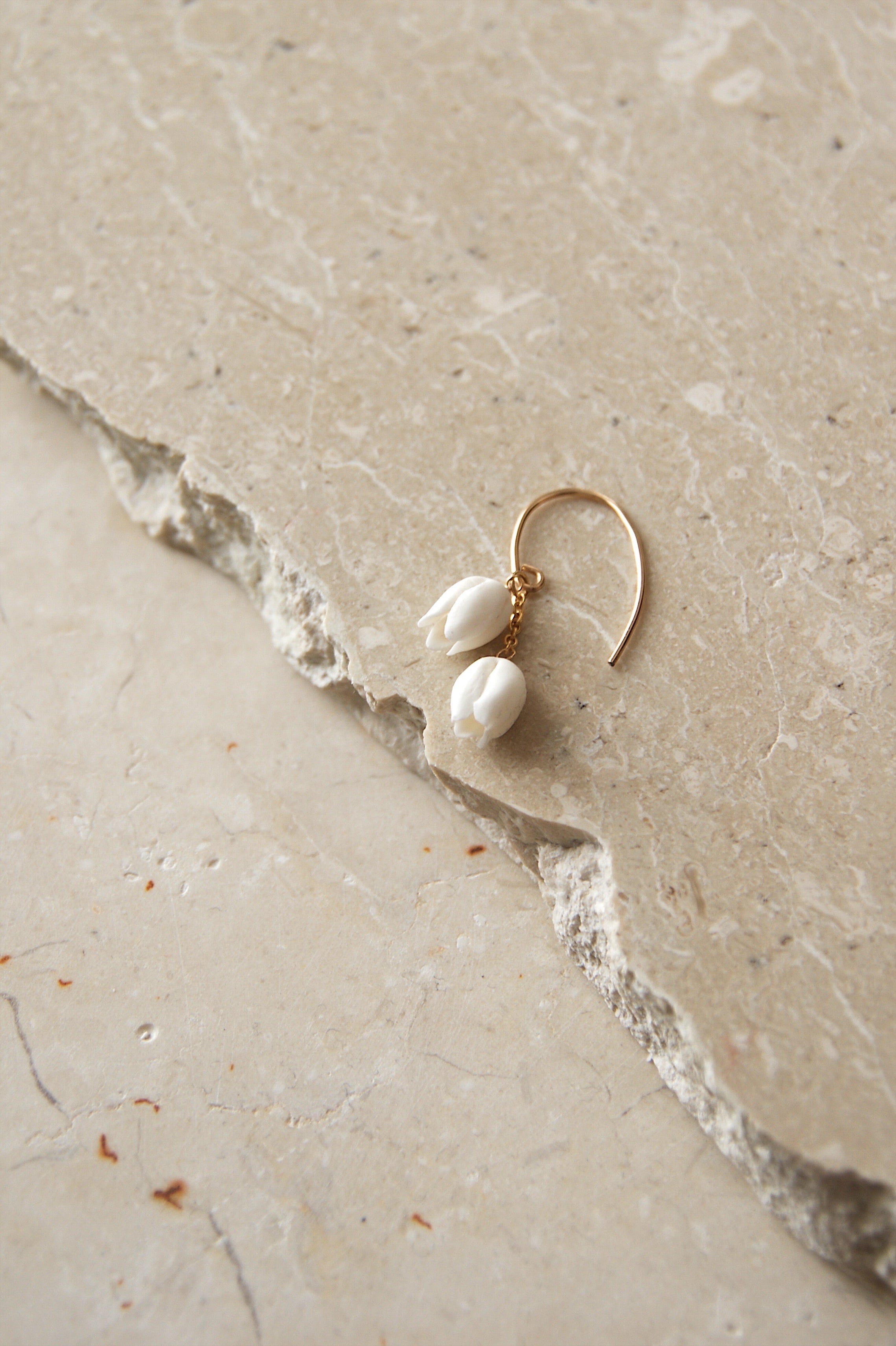 すずらんをモチーフにした耳飾り。あたたかみのある白いクレイでひとつずつ丁寧に、小さなつぼみを手作りしました。コロンとして愛らしいシンプルなデザインは、日々のコーディネートのちょっとしたアクセントにぴったりです。
