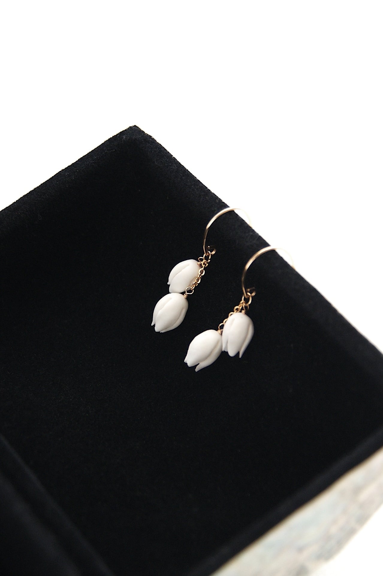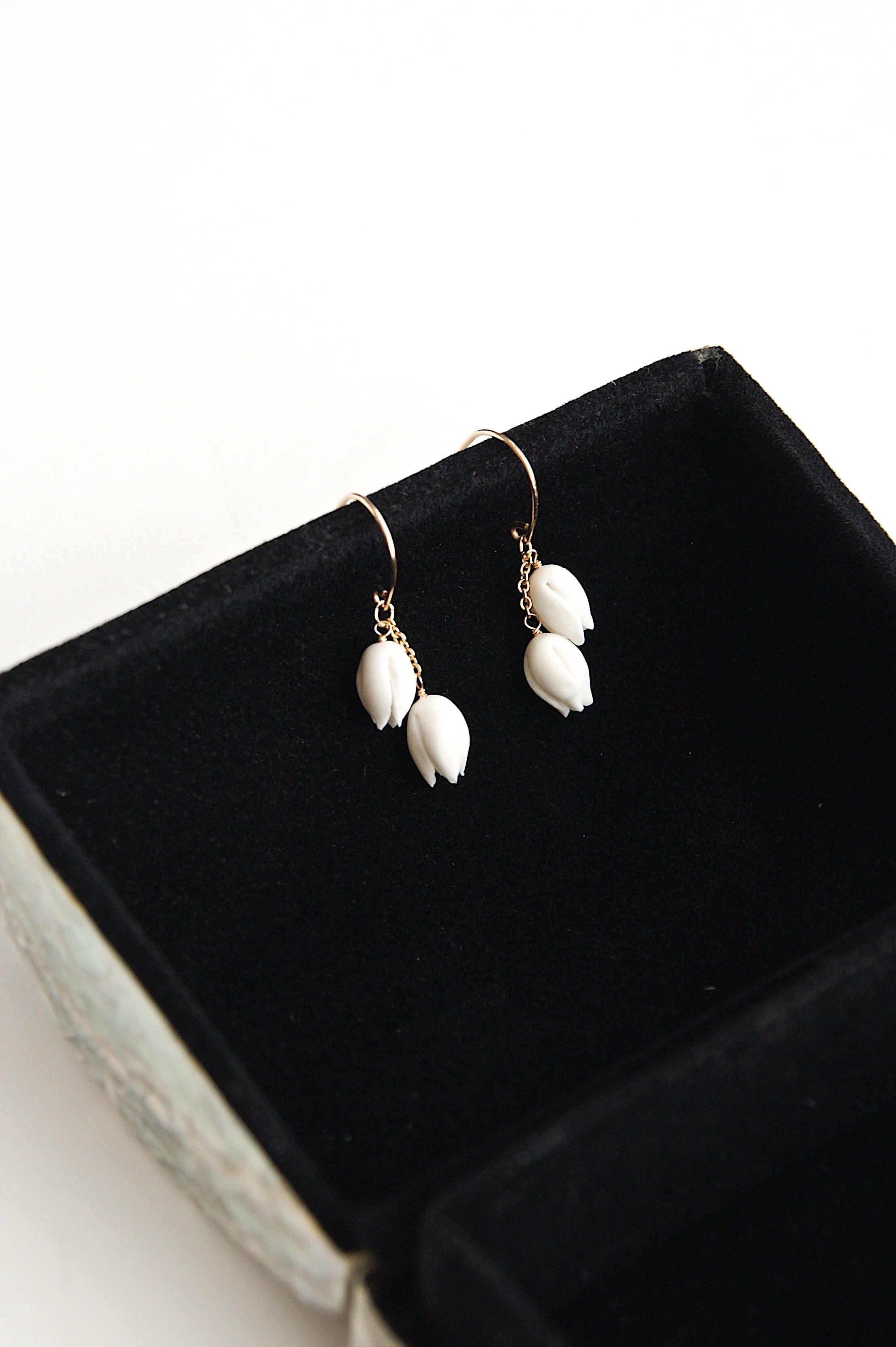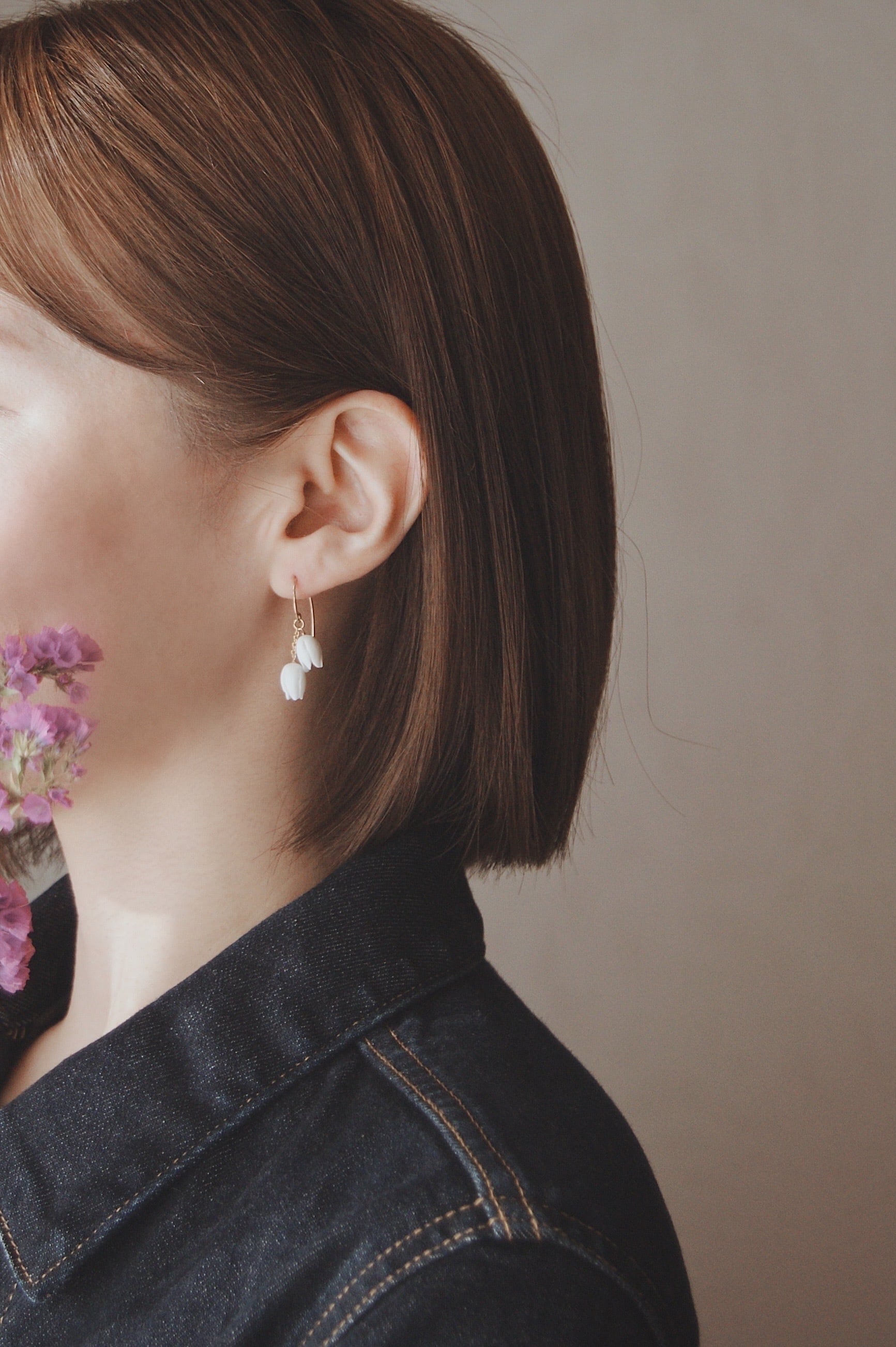 すずらんをモチーフにした耳飾り。あたたかみのある白いクレイでひとつずつ丁寧に、小さなつぼみを手作りしました。コロンとして愛らしいシンプルなデザインは、日々のコーディネートのちょっとしたアクセントにぴったりです。