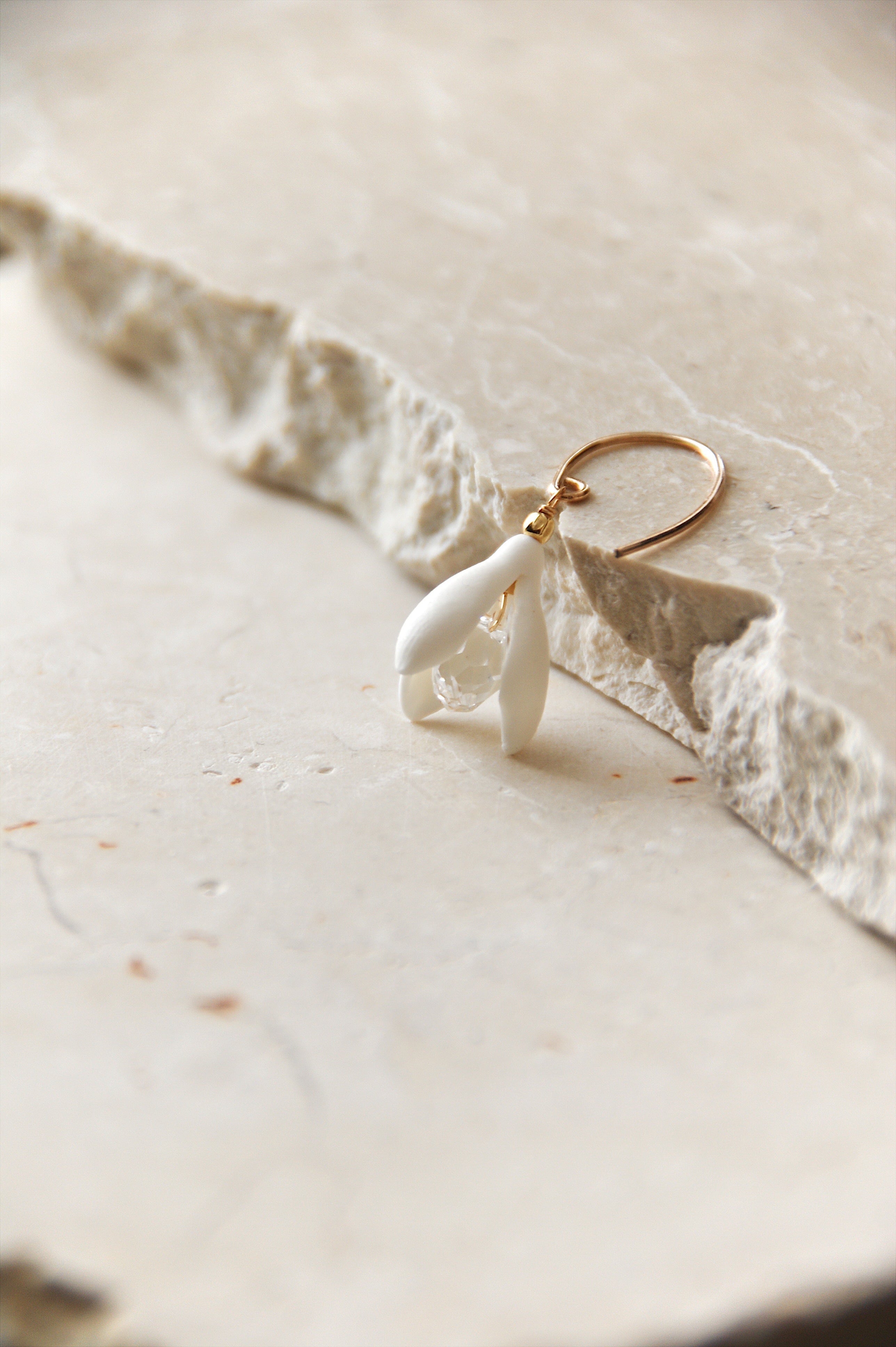 花びらがそっと開くと、つぼみの中でねむっていた宝石がきらっと顔をのぞかせます。クレイで成形した3枚の花びらは、開きはじめのつぼみをイメージしています。ゆるやかなカーブを描き、マットであたたかみのある白が映えるすっきりとしたデザインにしました。花びらに入れた深いスリットの間から、スワロフスキーカットガラスが見えかくれする可憐な耳飾りです。